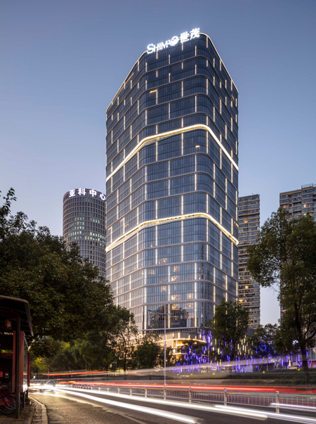 酒店北面及南面可鸟瞰钱塘江及其支流,建筑布局上以此为依据来确定塔楼的方位及布局以充分利用这些天然的美景,也同时确保了基地北面的住宅有足够的日照与景观。酒店塔楼通过体量的柔和转角使拥有良好江景的客房数量达到了最大化。